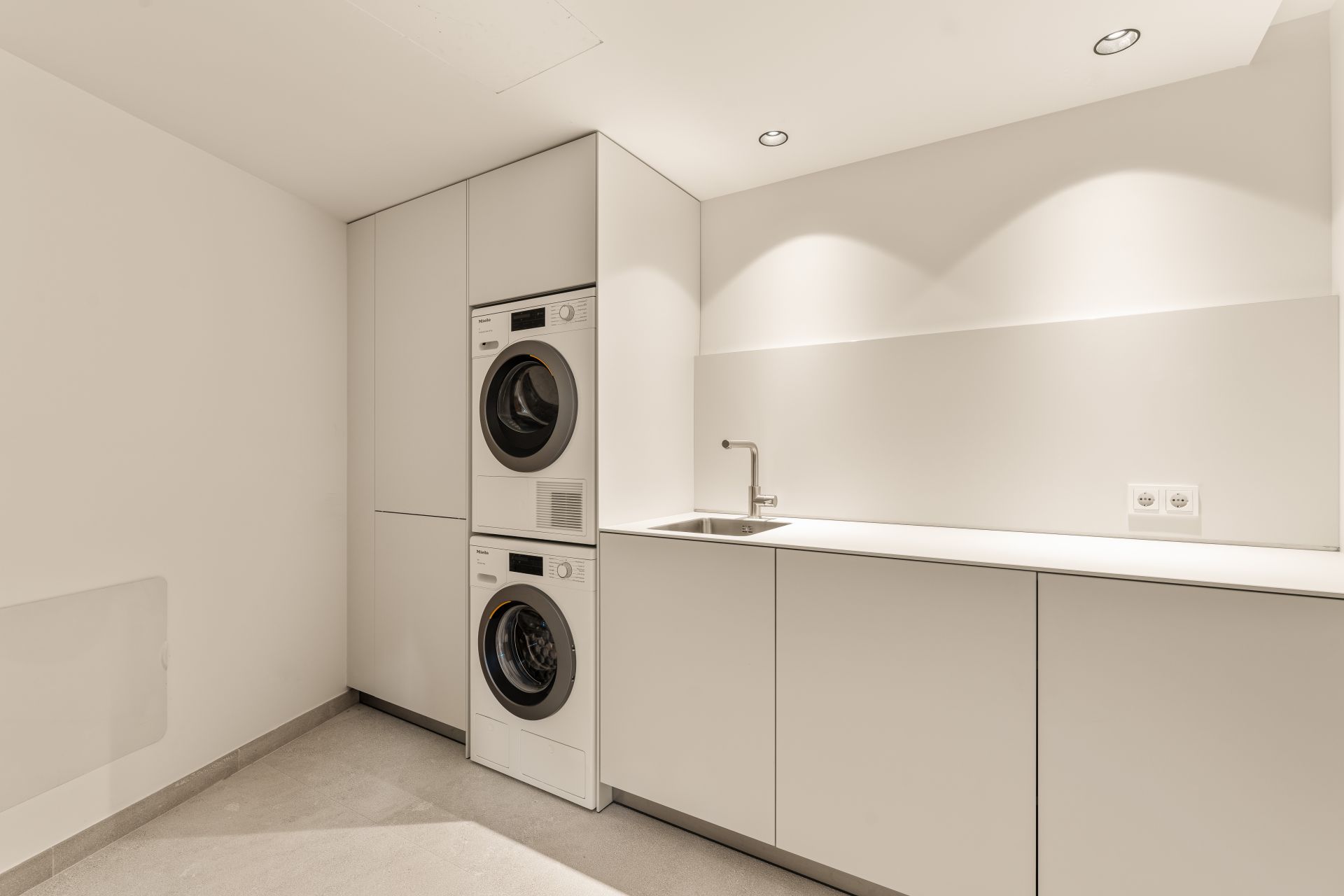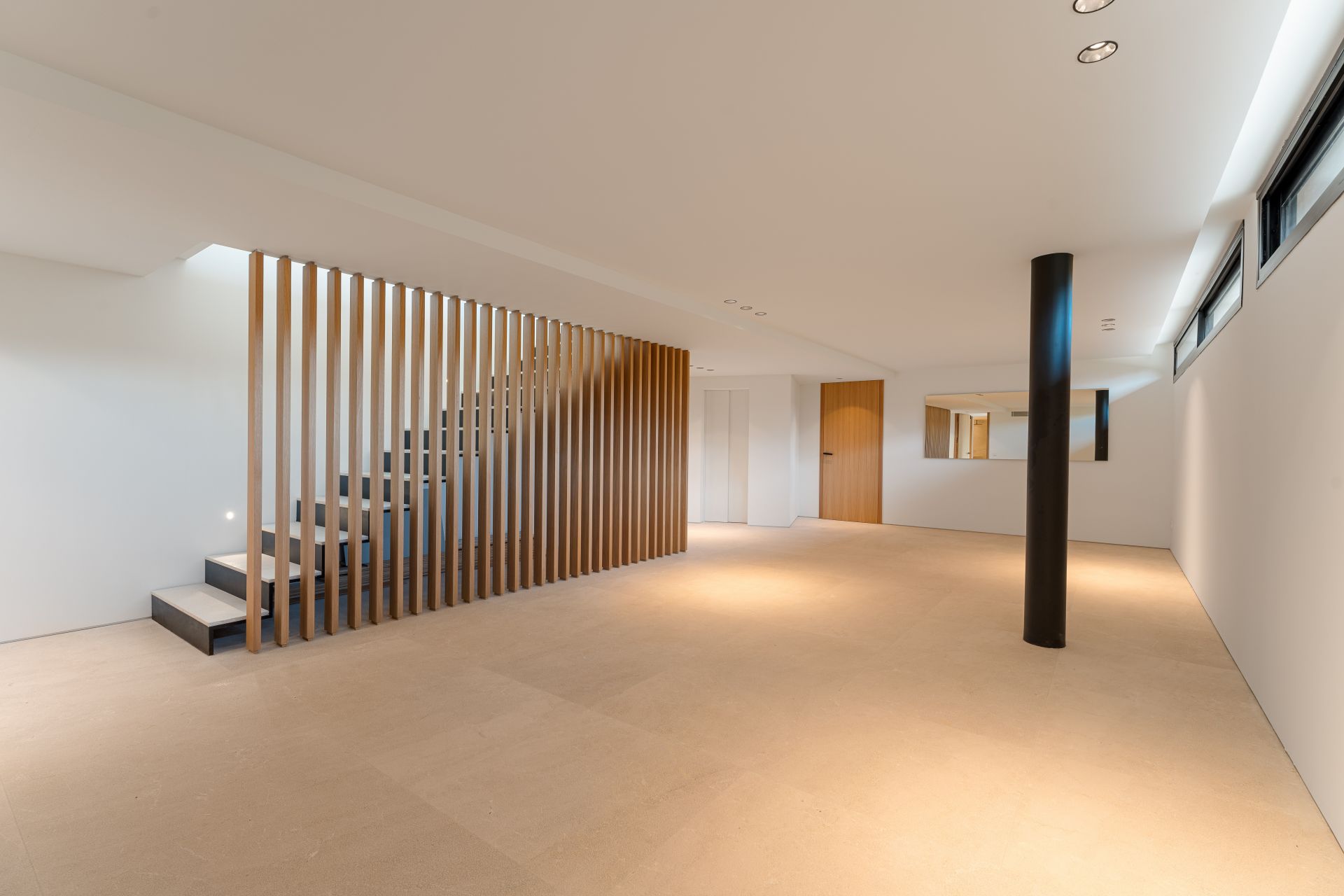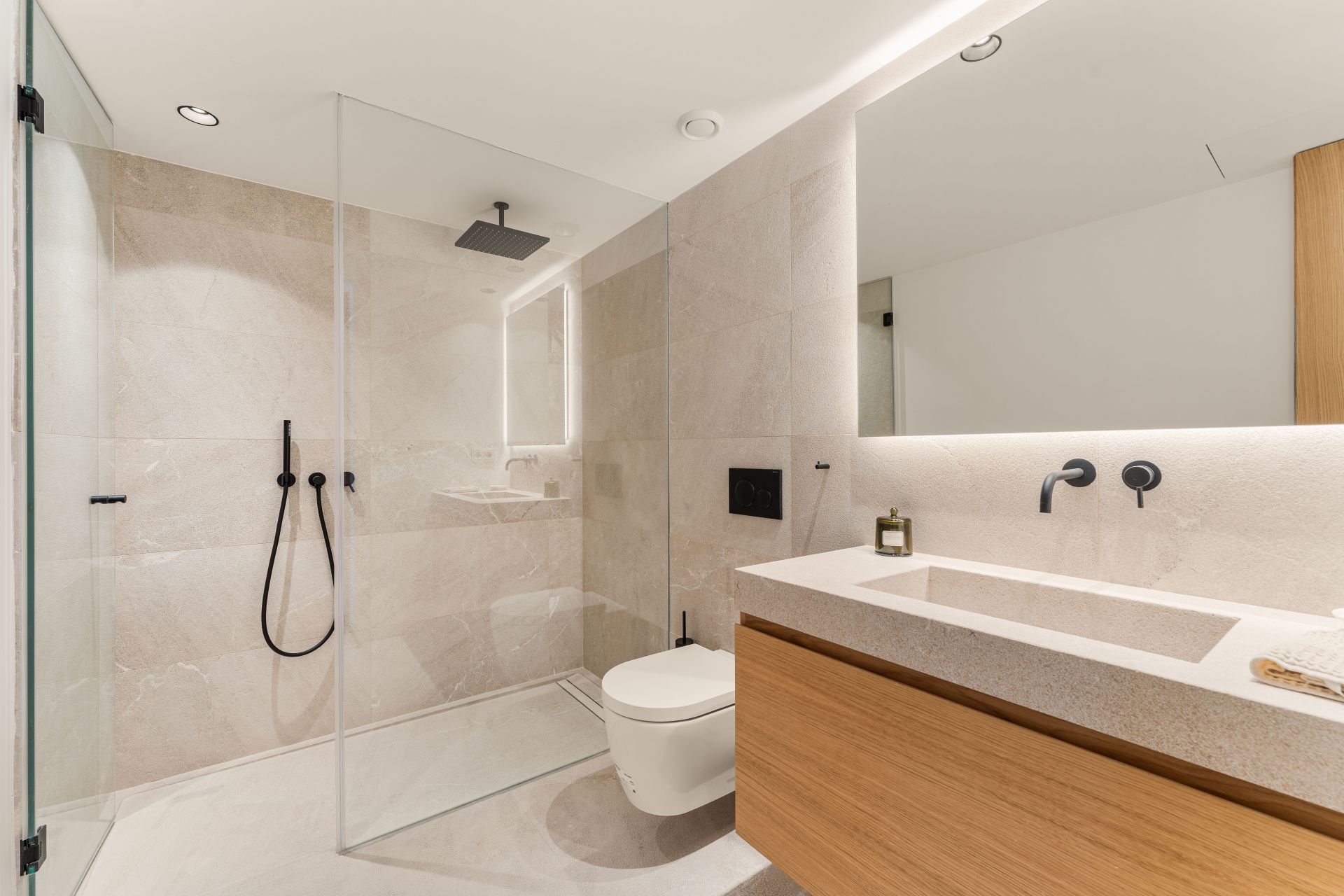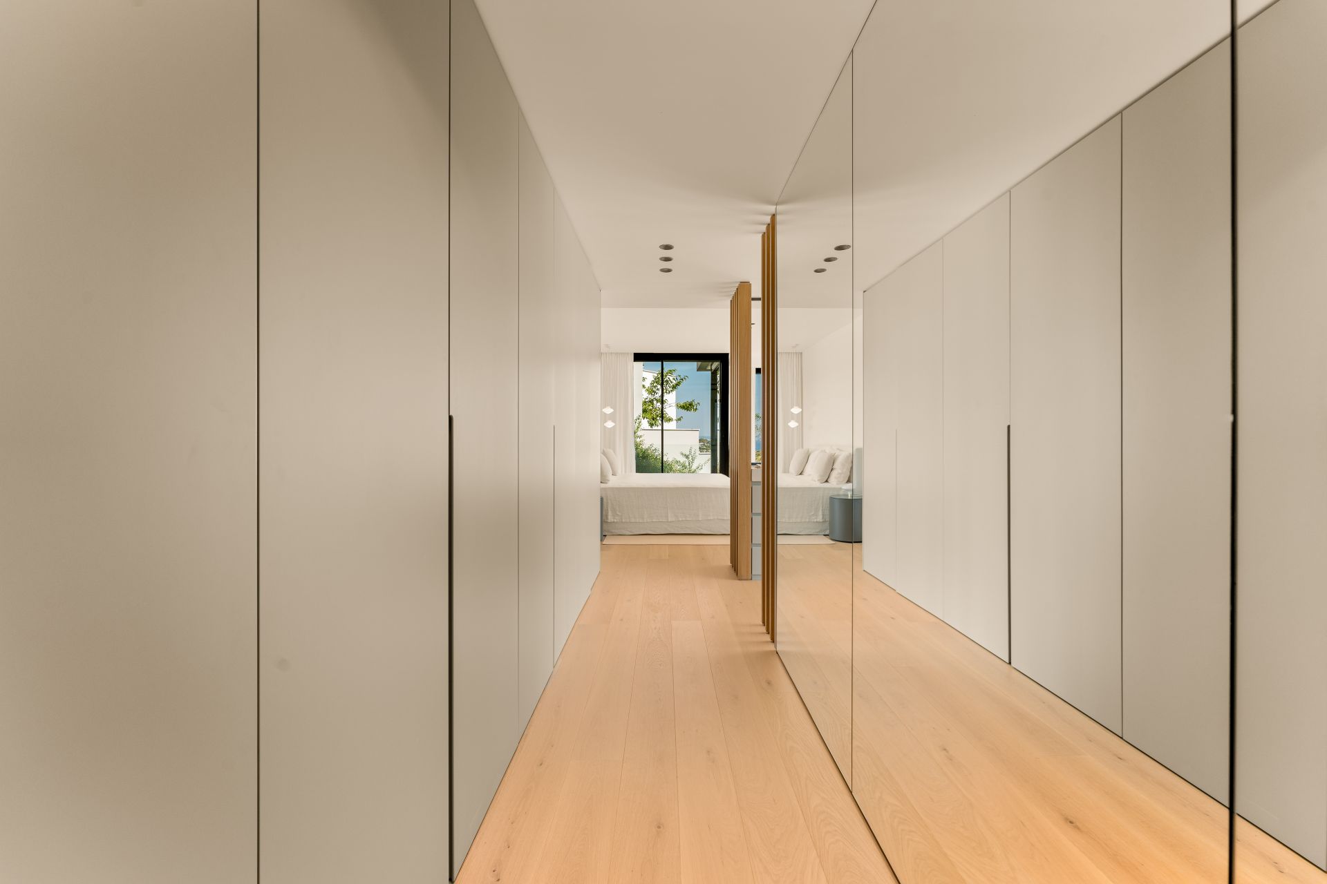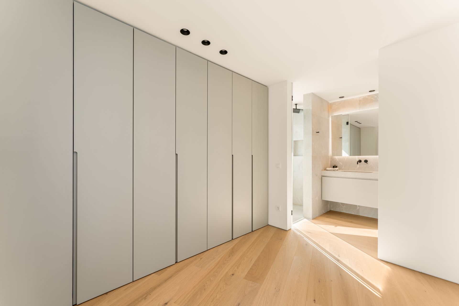 On the first floor, the main bedroom suite includes its own terrace, luxurious bathroom, and generous storage. Two further guest suites share the level, each designed with privacy and comfort in mind. The lower level houses an additional guest suite and a flexible space that can serve as a gym, cinema, or games room. A lift connects all floors, ensuring ease of movement throughout the home.